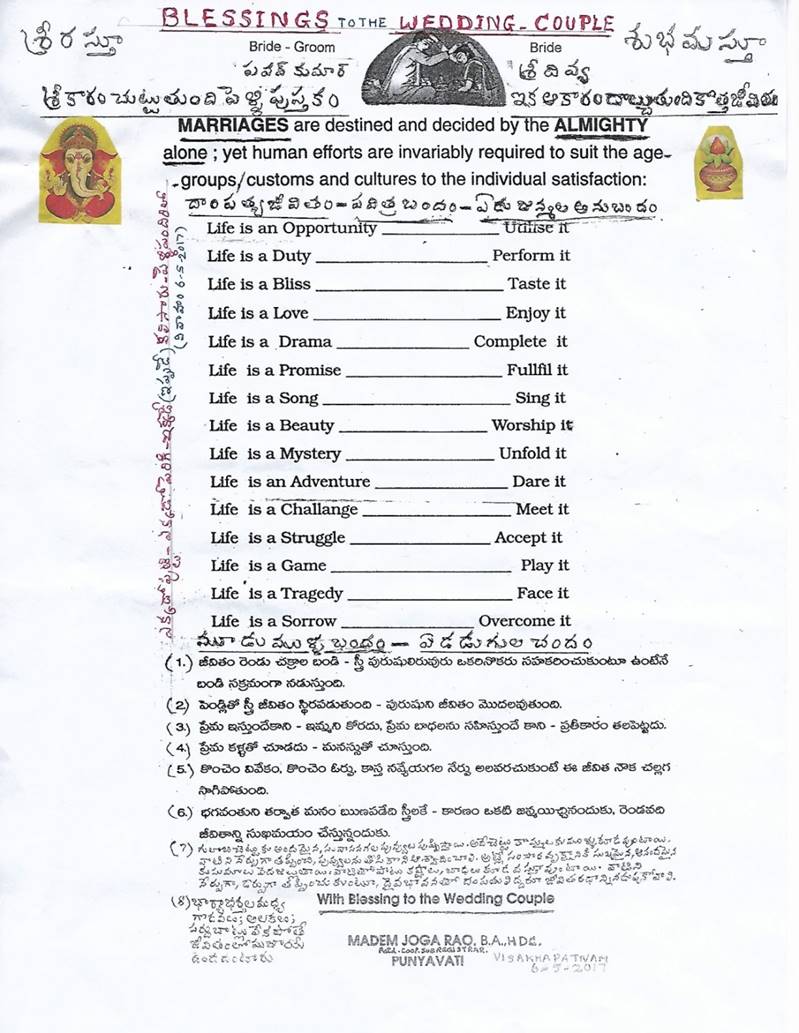 పుణ్యవతి :- చోడవరము(కొండగాలి)లో జన్మించి; విశాఖలోని సముద్రముపై వీచే ఉప్పునీటి గాలిలో పెరిగి మేనత్తకు పెంపుడు కూతురై నాకు సహధర్మచారిణియైనది. మా వైవాహిక జివితము ప్రారంభమైన మరుక్షణమునుండి సమిష్టి జీవిత యాత్ర తుది వరకు అను నిత్యము ఉదయం నుండి రాత్రి వరకు అనేక కీచులాటలతోను (వాదోపవాదనలతో) సంవత్సరాలతరబడి నిత్య జీవితము గడచినను అన్యోన్యప్రేమానుబంధములతో సమిష్టి సహకారములతో జీవించుచు నాకు సంభవించిన అనేక కష్టసమయాలలో మిక్కిలి ఓర్పు, నేర్పులతో సేవలు చేసినందులకు కృతజ్ఞత తెలుపుట తప్పు కాదని భావించితిని. మాకు ముగ్గురు కుమారులు, ఒక కుమార్తె కలిగిరి. గత సంవత్సరాల లోని విద్యా పరిణామాల రీత్యా అధిక విద్యలకు నేను సహకరించ లేకపోయిననూ డిగ్రీ చదువులవరకు చదివించగలిగితిని. నా ఉద్యోగములో నిస్వార్ధ సేవల ఒత్తిడిలోను, ఆర్ధిక, అనారోగ్య ఒత్తిడిల లోనూ ఎక్కువగా శ్రమించుతూ జీవిత నౌక ప్రయాణములో కాలము గడుపుతూ కుమారుల ఉద్యోగ ప్రయత్నములకు నా వంతుగా ఎట్టి సహకారము చేయలేకపోతిని. కుమారులు మువ్వురూ ఎవరికి వారు దైవానుగ్రహముతో వారి వారి జీవితపోషణలకు ఏనాడూ ఏ విధమైన లోటుపాట్లు లేకుండా వారి వారి నిత్య జీవితాలను అనుభవించుచుండిరి. మాకు గల భాధ్యతల రీత్యా ముగ్గురు కుమారులకు సత్ సంప్రదాయ కుటుంబముల లోని వారి కుమార్తెలను భార్యలుగా వివాహములు చేసి మా ధర్మమును నెరవేర్చగలిగితిమి. అట్లే మాకు గల ఒకే ఒక కుమార్తెకు సత్ సాంప్రదాయముగల కుటుంబమునకు చెందిన విద్యుత్తు శాఖలో ఒరిస్సా గవర్నమెంటు ఉద్యోగములో ఎలక్ట్రికల్ ఇంజనీరు పదవిలో మిక్కిలి వినయ విధేయతలు గల అల్లుడిని దైవానుగ్రహముగ వివాహము చేయగలిగితిమి. మా కుమార్తె యున్నూ, అల్లుడైన జగదీశ్ ను పెద్దల యెడల, మరియు తల్లిదండ్రులయందును ప్రత్యేకమైన గౌరవ భావములు కలవారు.
