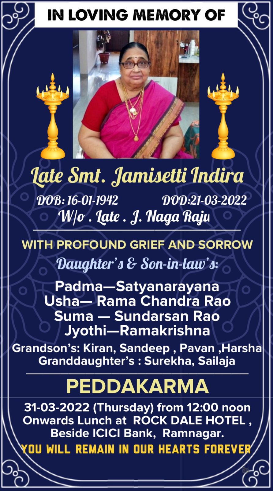 Smt. Jamisetti Indira was born on 16th January, 1942 in Vizag to Katta Srinivas(father) and Suryakantham(mother). She was the eldest of three daughters and four sons. She passed SLC schooling. She was married to Jamisetti Nagaraju on Aug 12, 1960 at Vizag and raised four daughters - Padma, Usha, Suma and Jyothi.