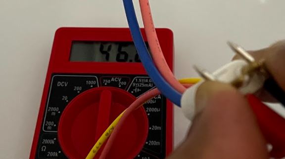 To test the heater assembly you can use a multi-meter. Set the multimeter to read resistance. Connect the two leads of the multimeter to those of the heater wire harness as shown. If the heater is good, you will see a reading