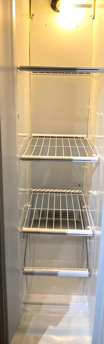 1. Remove contents and racks on freezer side of the refrigerator. To remove the rack, pull it up on the right side and then pull.